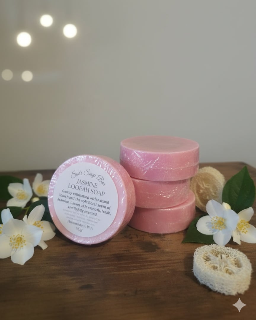 This round, pink soap bar blends the soft, floral scent of Jasmine with the gentle exfoliation of a natural loofah. As it lathers, it buffs away dry skin, leaving your body feeling smooth, refreshed, and delicately scented.