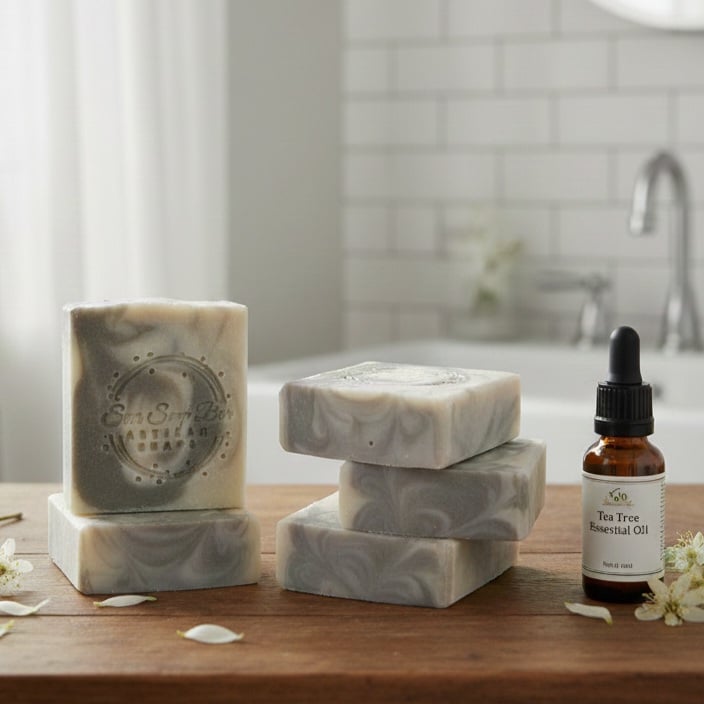 Tallow Soap, meticulously crafted from 100% grass-fed tallow, enriched with sea clay, and infused with the invigorating Tea Tree essential oil, which also offers natural antimicrobial benefits for your skin.